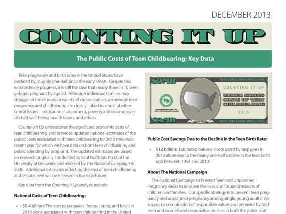 This fact sheet summarizes the national costs of teen childbearing that were produced through the Counting It Up project.